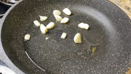 Отправляемся жарить. Наливаем масла на сковороду и закидываем чеснок. Слегка его обжариваем, чтобы он отдал свои ароматы маслу.