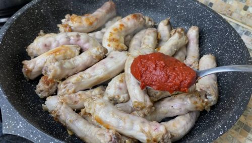 Когда шейки будут слегка обжарены — добавим столовую ложечку томатной пасты, перемешаем и обжарим.