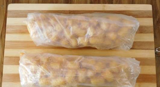 Мы, дома, из полученной массы формировали колбаски. Для этого брали полиэтиленовые пакетики и закладывали еще горячую массу в пакеты, равномерно распределяя ее вдоль дна и как скалку для теста прокручивали руками по столу для уплотнения.