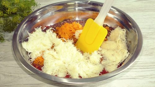 Морковь натираю на мелкой тёрке и отправляю в печеночную массу, картофель тоже натираю на мелкой тёрке, отжимаю, отправляю в общую массу и перемешиваю, чтобы не потемнел.