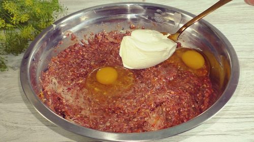 Далее добавляю яйца, сметану и если масса немного жидкая, я добавляю 1 ст. л. манной крупы.