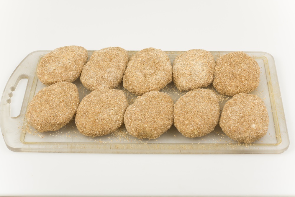 После этого добавь к фаршу яйцо, специи и соль и всё хорошенько перемешай. Мокрыми руками формируй котлеты и обваливай их в панировочных сухарях.