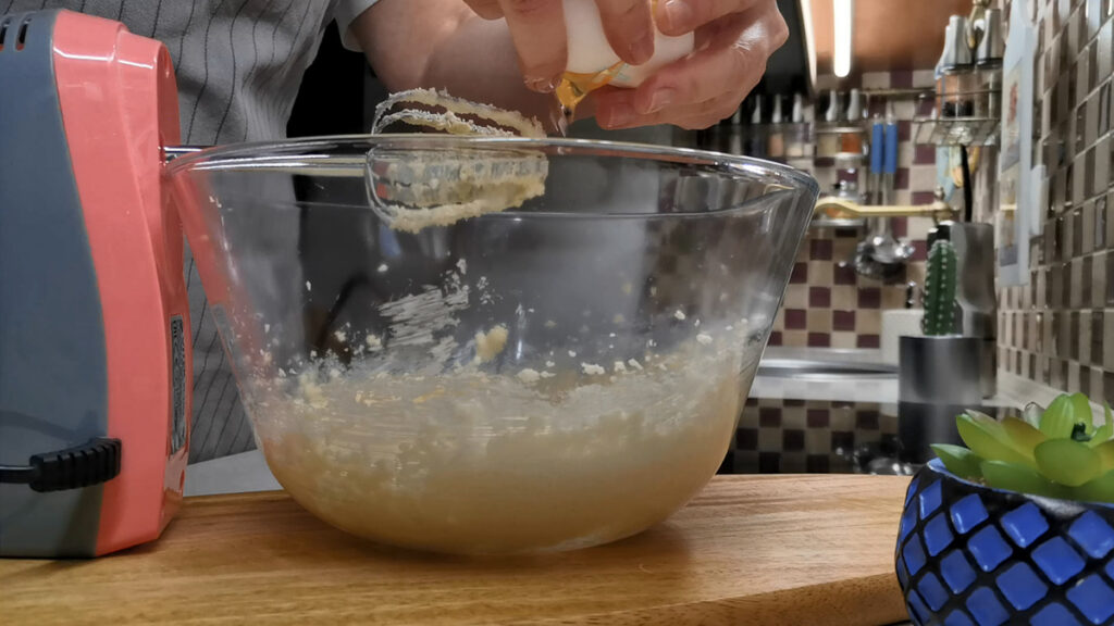 Затем вводим яйца. Их тоже достаем из холодильника заранее, пусть будут комнатной температуры. Яйца вводим не все сразу скопом, а постепенно, по одному. И после каждого раза слегка взбиваем.
