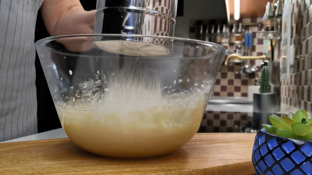 И теперь последнее — мука и разрыхлитель. Смешиваем их в отдельной ёмкости и затем просеиваем в нашу масляную смесь. Перемешиваем лопаточкой или венчиком до однородного состояния. В миксере больше необходимости нет.
