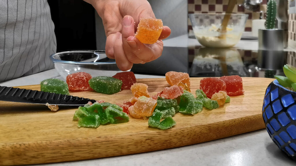Единственное, что желательно, так это то, чтобы он был разноцветным. Так эстетичнее и наряднее для праздника. Режем мармеладинки на небольшие кусочки. Часть откладываем в сторонку для украшения, совсем немного.