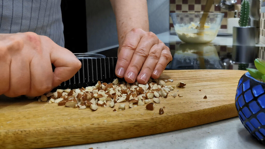 Далее берем орешки. Можно абсолютно любые. У меня в этот раз была меленькая горстка жареного миндаля. Остался от чего-то, не помню уж, от какого рецепта.
