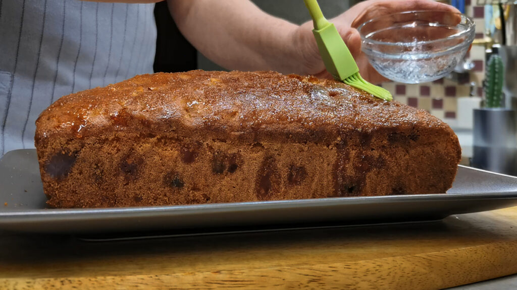 Готовый кексик, когда он немного остынет и мы вытащим его из формы, смазываем сахарным сиропом. Сироп простой — берем одну часть сахара и две части воды. Просто растворяем и все. Ничего не варим и не прогреваем.