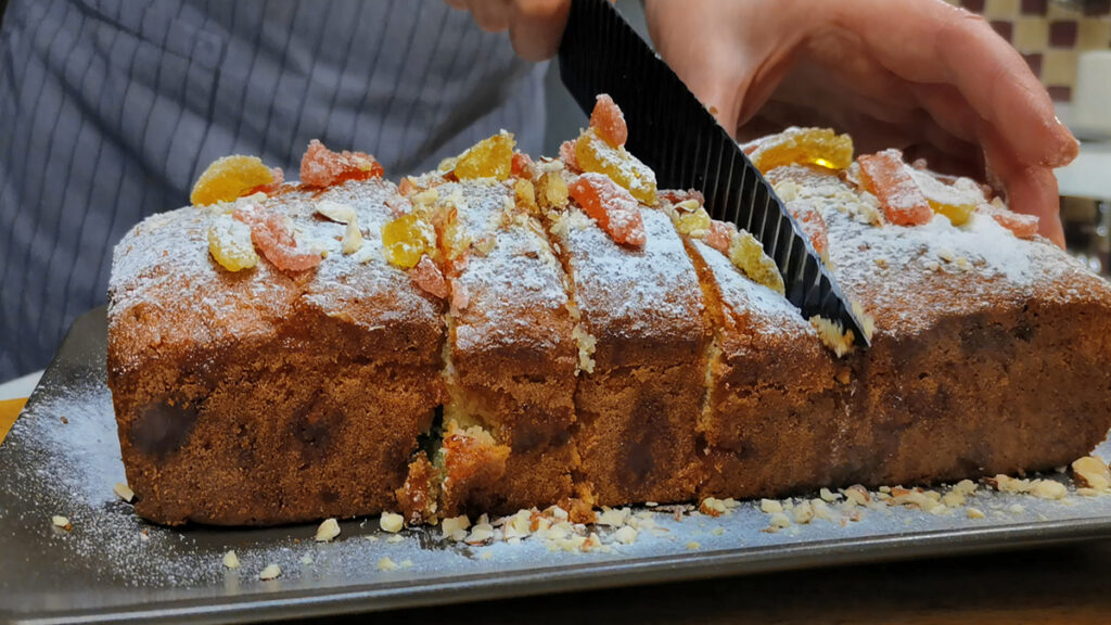 А внутри так настоящее чудо! Пышный, пористый, с такими славными прозрачными мармеладными цукатиками. И орешки в нем очень к месту.