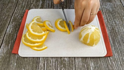 1 крупный лимон разрезаем пополам. С одной половинки срезаем кожуру и удаляем косточки. Вторую половинку нарезаем на тонкие ломтики.