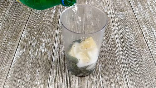 Из 5-8 веточек мяты обрываем листики. Количество мяты по вашему вкусу. В чашу погружного блендера складываем большую часть листьев мяты, добавляем очищенный лимон и вливаем немного спрайта.