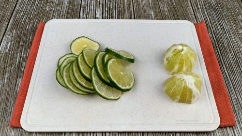 Для начала берем 2 лайма. Первый очищаем от кожуры и нарезаем на кусочки, косточки удаляем. Второй нарезаем тонкими ломтиками.