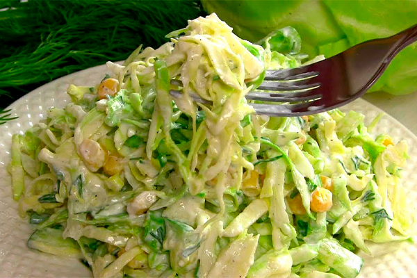 Салат из молодой капусты, огурцов, со сметаной
