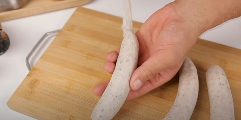 2. Несколько сосисок очистить от оболочки и выложить в сковороду. Также добавьте фарш и очень хорошо перемешайте, затем приправьте состав солью и черным молотым перцем по вкусу.