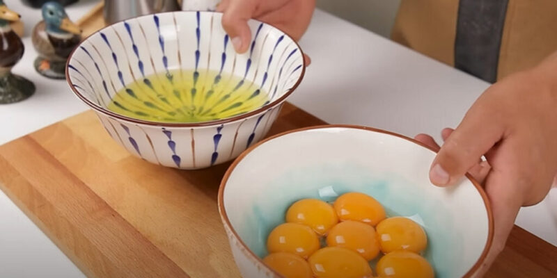 4. Приготовьте тесто: отделите белки от желтков и разложите их по разным мискам.