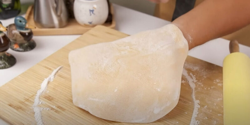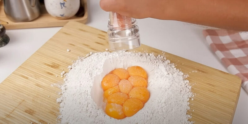 5. Просейте муку на кухонном комбайне или в миску. Сделать в нем углубление, добавить желтки и соль и замесить не прилипающее к рукам мягкое тесто. Заверните его в пищевую пленку и дайте отдохнуть 5 минут.