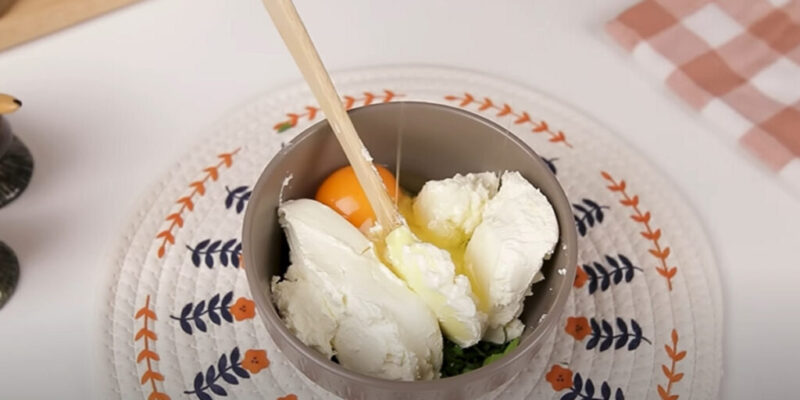 6. Приготовьте творожную начинку: мелко нашинкуйте петрушку. Поместите его в миску и смешайте с творогом Рикотта и яйцом.