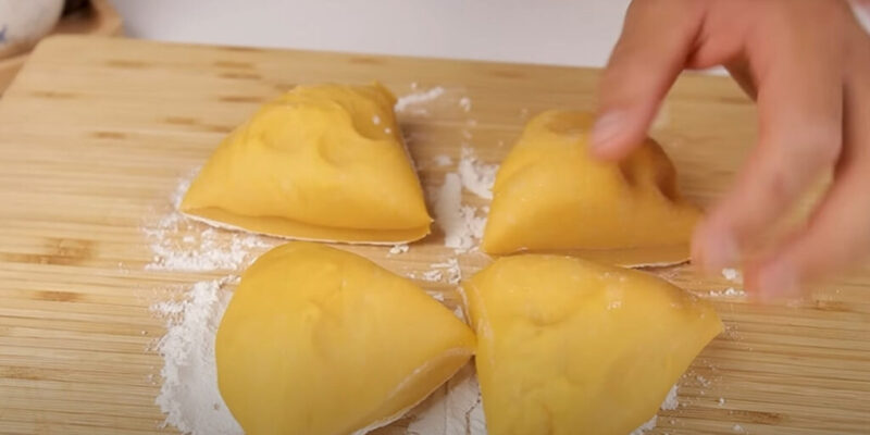 7. После этого посыпьте чоппер 50 г муки, возьмите шарик теста и разделите его на четыре равные части. Сформируйте из них шарики.