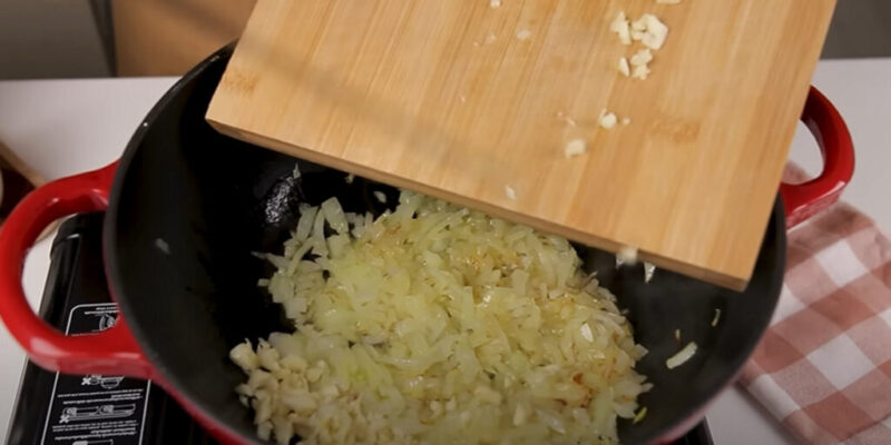 1. Приготовьте мясную начинку: лук почистите, нарежьте кубиками и обжарьте на разогретой сковороде с растительным маслом до румяности.