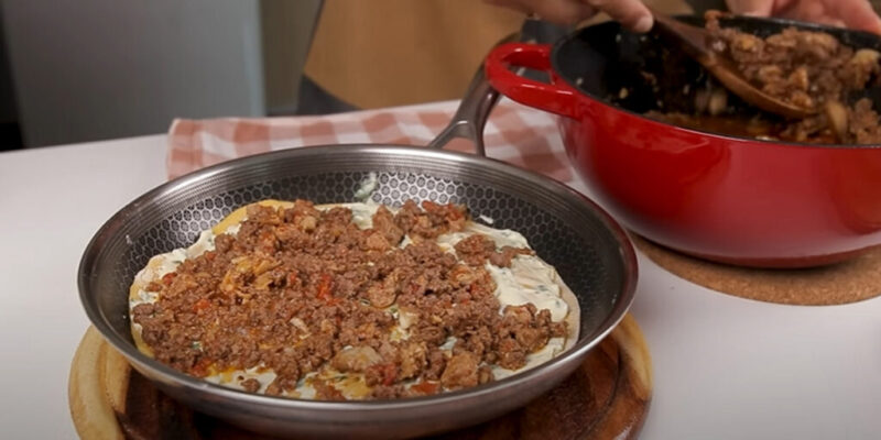 9. Теперь возьмите противень и положите на его основание первое письмо теста. Сверху добавьте четверть творожной начинки и равномерно распределите ее. Затем выложите четверть мясной начинки, которую посыпьте сыром и тертым пармезаном. Продолжайте эти шаги слоями до тех пор, пока не закончите все пищевые компоненты.