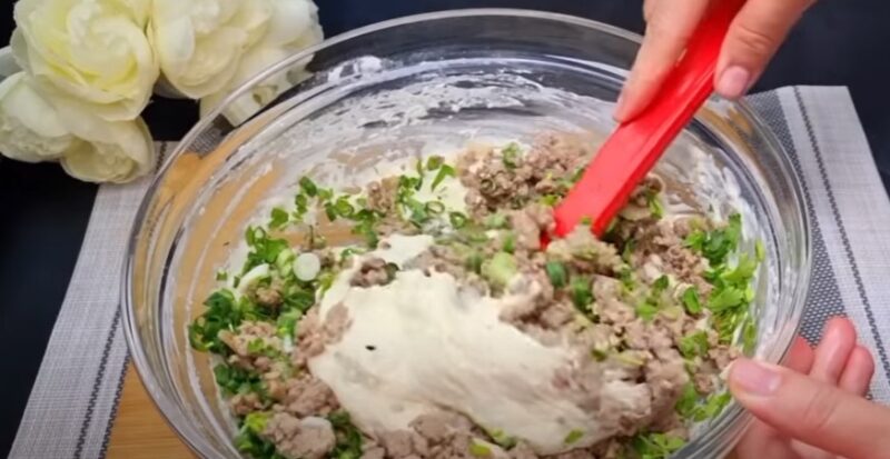 Шинкуем мелко зеленый лук, добавляем в тесто вместе с обжаренным фаршем, смешиваем. В сковороду с горячим растительным маслом выкладываем по столовой ложке теста.