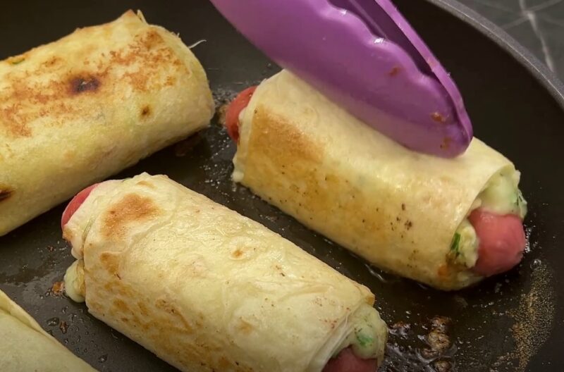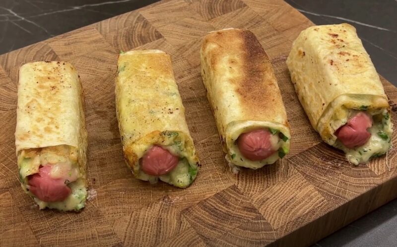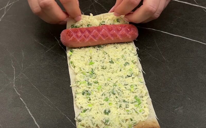 Нарезаем лаваш на полоски по ширине чуть уже, чем сосиски. Смазываем каждую ленту из лаваша сырной смесью. На кончик ленты кладем сосиску и заворачиваем сырной массой внутрь.