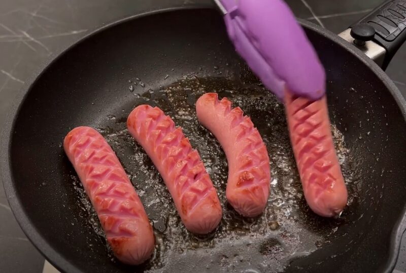Делаем на сосисках небольшие крестовые надрезы с разных сторон. В сковороде на растительном масле обжариваем сосиски.