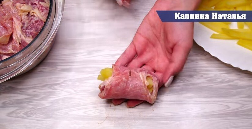 Прошел 1 час, берем пластинку мяса, кладем немного лука из маринада, кладем небольшой пучок подготовленного картофеля и заворачиваем рулетик, закрепляем деревянной шпажкой.