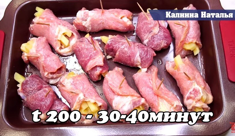 Противень смазываем растительным маслом, кладем рулетики и ставим в разогретую духовку, готовим при 200 градусах 35-40 минут.