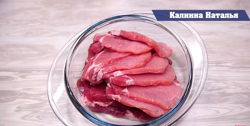 Мясо филе, у меня свинина нарезаем на длинные тонкие пластинки толщиной примерно 4-5 мм. Кладем в миску.