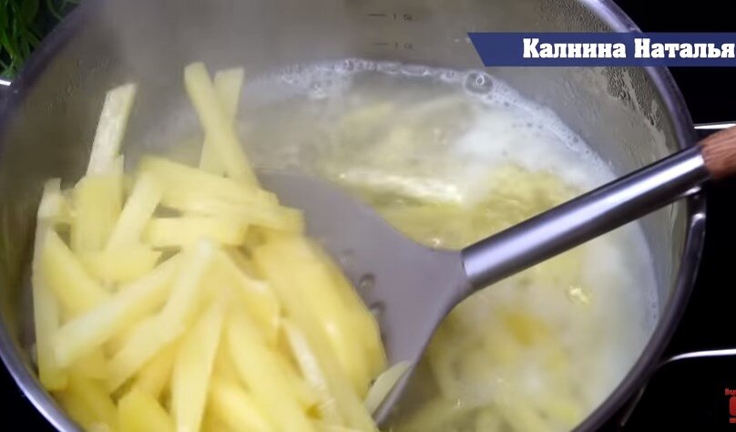 Картофель очистим и нарежем соломкой. В кастрюлю наливаем воду, добавляем соль и ставим на огонь, с момента закипания варим 2-3 минуты, но не больше и вынимаем.