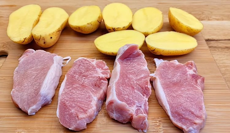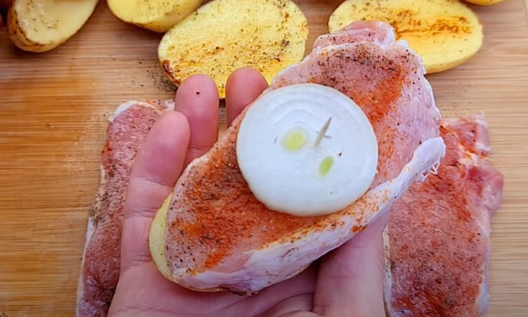 1. Разрежьте 4 картофелины вдоль. Посолите и поперчите картошку и кусочки мяса. Добавьте паприку и по своему вкусу подберите разнообразные специи, тщательно их втирая в мясо и картошку. Нарежьте 1 луковицу кольцами.