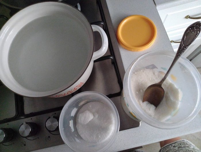 Готовлю рассол: на литр воды по 2 ст. л. сахара и соли, перемешиваю и даю закипеть.