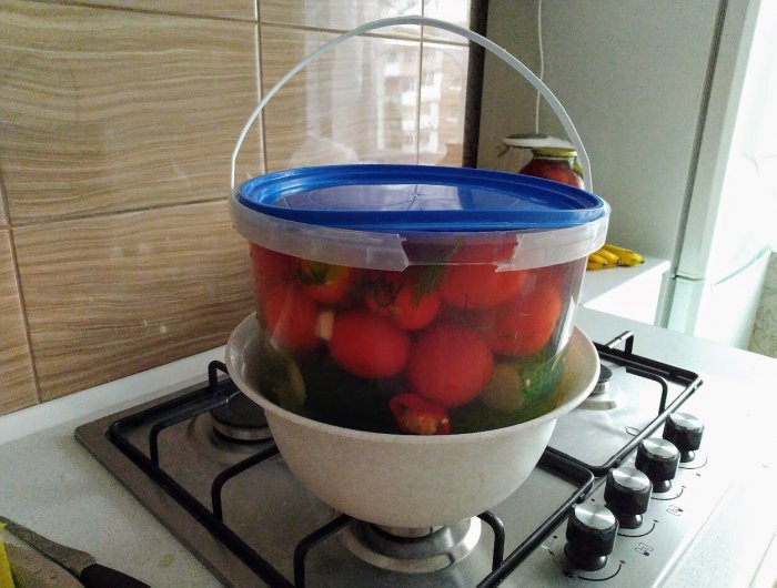 Это лучше, чем если бы она стекла на пол или стол, где при комнатной температуре будут заквашиваться помидорчики в ближайшее время.