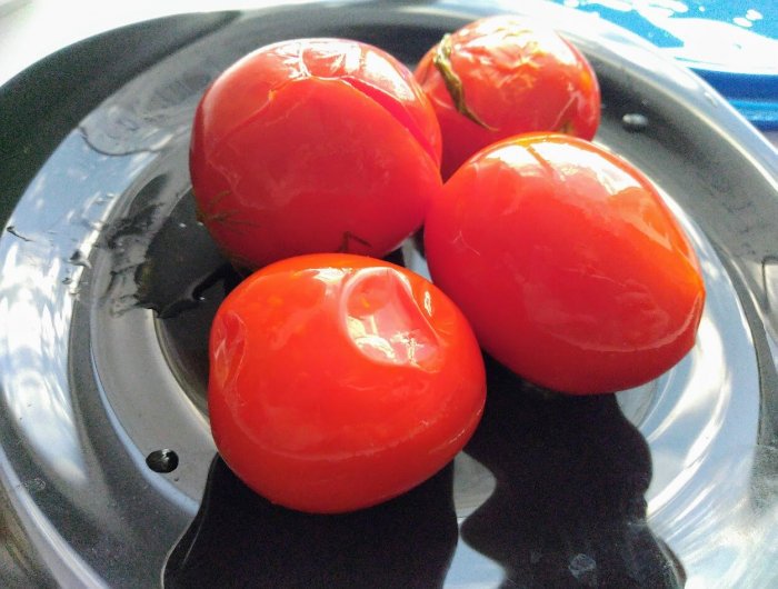 Помидоры лучше всего брать тонкокорые, не мясистые, а больше водянистые. Сорт сливка сюда не подойдёт.