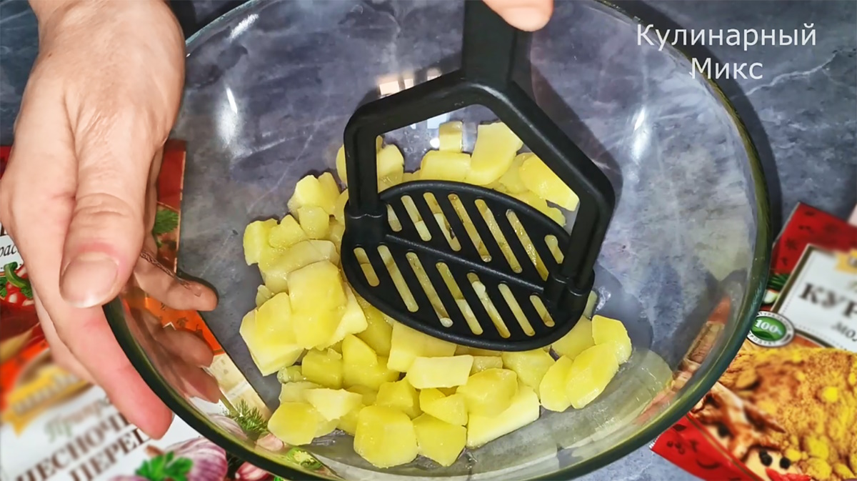 Перекладываю картофель в глубокую миску и разминаю толкушкой до состояния пюре.