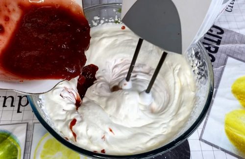 Взбивать нужно совсем недолго, сливки просто должны перемешаться с вареньем. Если Вы даже сейчас попробуете получившуюся массу, то Вам точно понравится этот вишнево-сливочный крем.