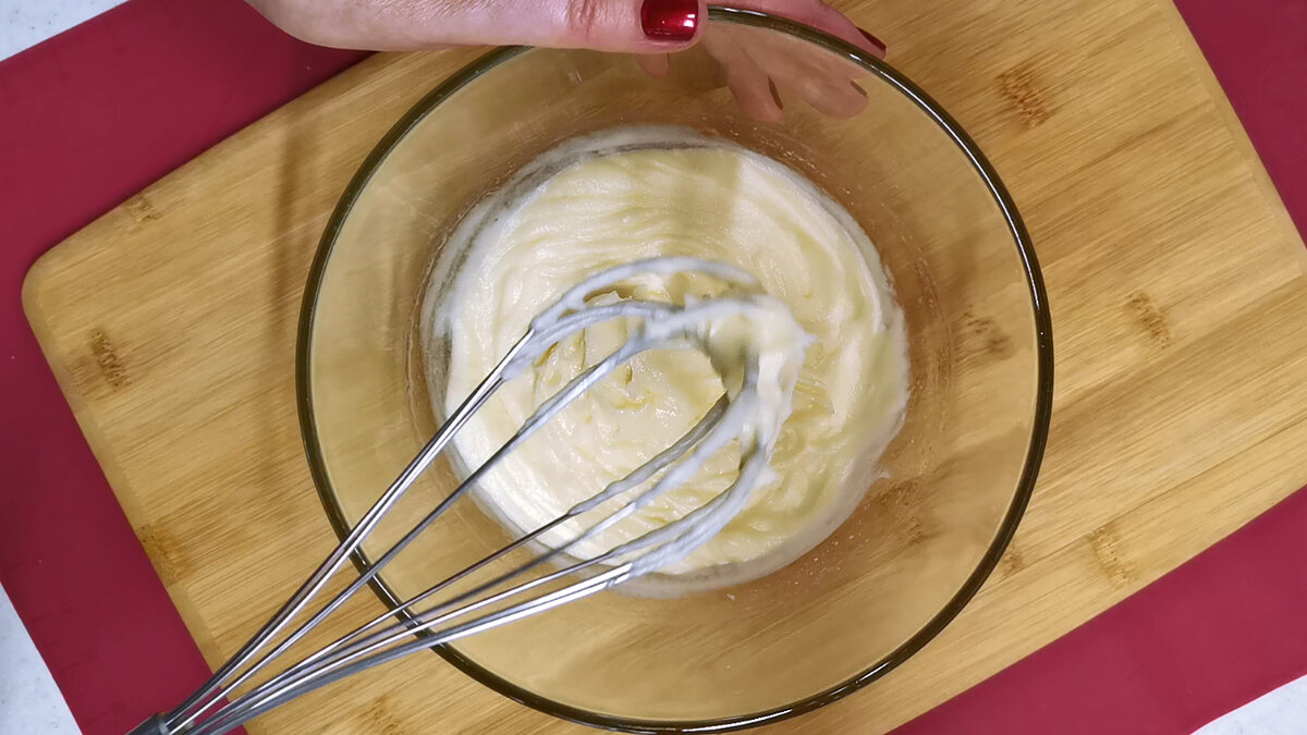И перемешать все это венчиком до растворения сахарных крупинок. Получится вот такая смесь цвета топленого молока и похожая по консистенции на не очень густой крем.