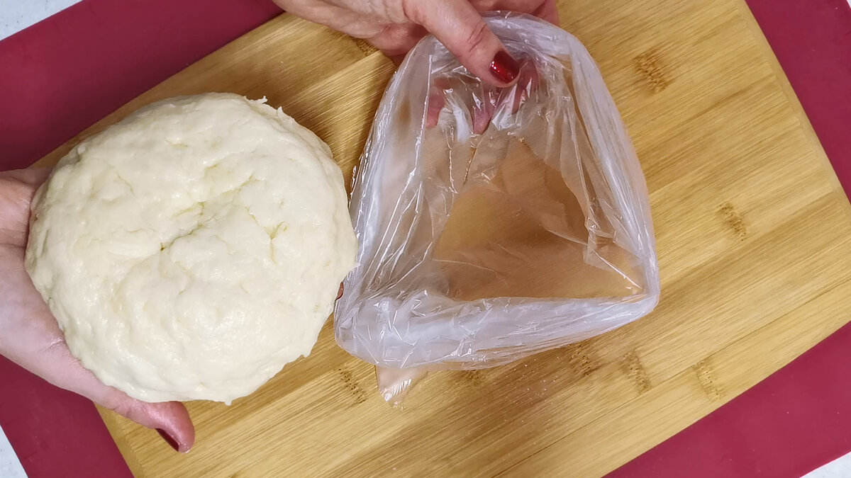 Тесто получится мягким и маслянистым. После вымешивания его нужно положить в пакет и убрать в холодильник на 20 минут.