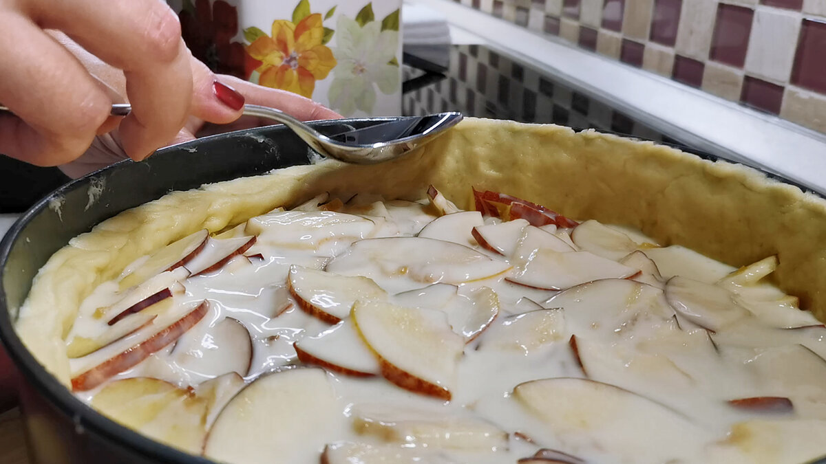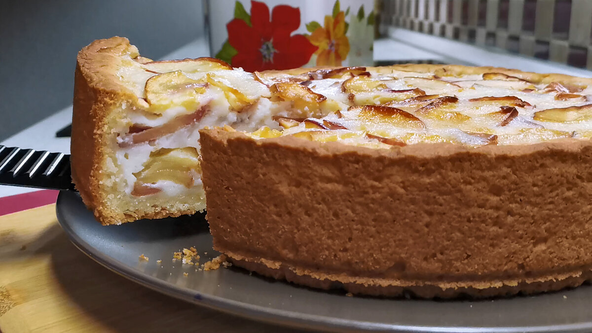 Такой красивый и эффектный пирог с яблоками я часто пеку как альтернативу Шарлотке. Готовится этот яблочный пирог совершенно несложно, несмотря на то, что с первого же взгляда он производит впечатление настоящего торта. Да и на вкус пирог ему совсем не уступает. Тесто у пирога хоть и песочное, но очень мягкое. А начинка состоит из большого количества яблок в нежной как крем сметанной заливке.
