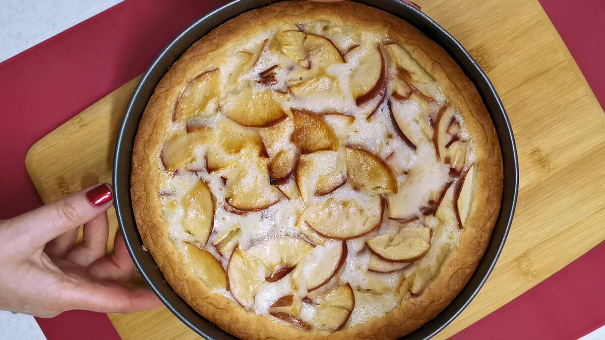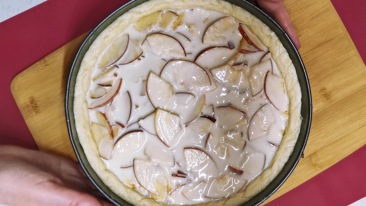 Вот так должен выглядеть готовый пирог. Тесто немного подрумянится, а заливка схватится. Пока пирог теплый, она будет мягкой, но уже довольно упругой.
