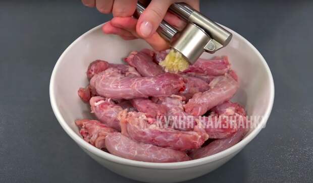 Куриные шеи мою (обязательно мою, хоть кто-то и пишет, что это нельзя делать почему-то), выкладываю в миску. Через пресс выдавливаю чеснок (2-3 зубчика).