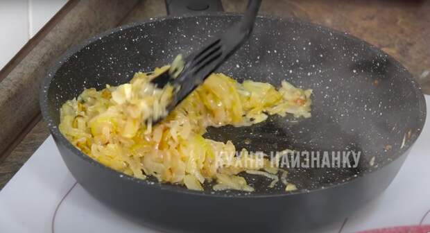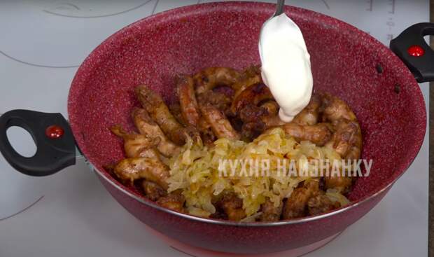 Когда вся жидкость выпарится, добавляю лук и сметану.