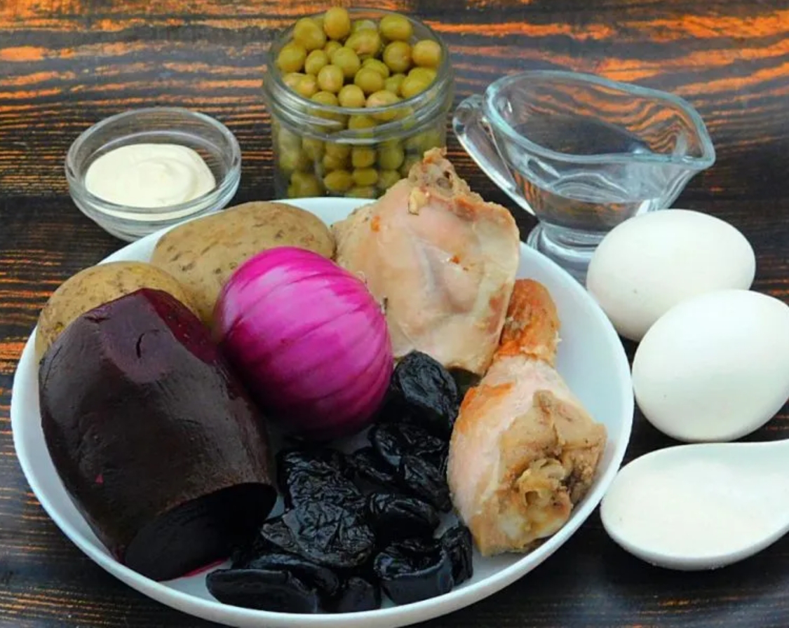 Отвариваем до готовности свеклу, картофель, яйца и куриное мясо. Чернослив перекладываем в отдельную тару, заливаем крутым кипятком на 5-10 минут.