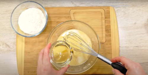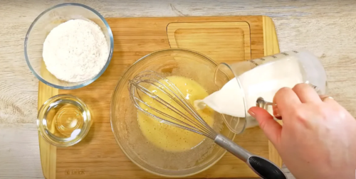 Вливаем молоко, масло растительного происхождения (можно заменить сливочным, только растопленным) и мешаем.