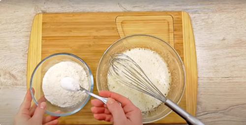 Всыпаем в муку пекарский порошок с горкой. Перемешиваем продукты между собой.