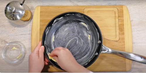 Нам понадобится сковородка, у которой толстое дно. Смазываем куском сливочного масла.