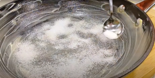 Равномерно высыпаем сахар на дно сковородки, который станет карамелью.