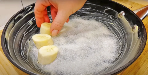 С бананов снимаем кожуру и режем его на кусочки и выкладываем сверху сахара.