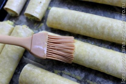 С краешка положим начинку в виде колбаски, свернем рулетик, отправим на противень с кулинарной бумагой, смазанной маслом, смажем смесью из желтка и молока. Это нам и даст ту роскошную румяность. Кстати, начиняя трубочки, не особо с краев старайтесь — лишнее пюре выдавится оттуда под воздействием высокой температуры.