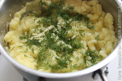 Готовый картофель, не дав ему остыть, мнем удобным способом и соединяем с растопленным маслом, нарубленным мелко чесноком и укропом. Берите всего столько, сколько вы хотели бы видеть в готовом блюде.